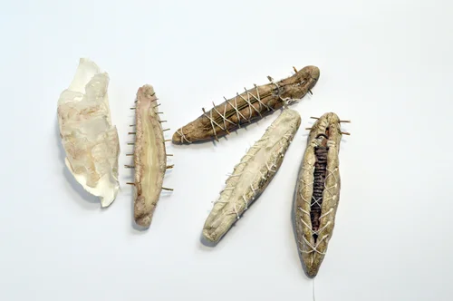 My series Cutting challenges the oppressive objectified and dehumanizing phenomenon of Female Genital Mutilation(FGM). This practice, still performed across the world, subjugates the female body and is a basic violation of women’s rights and future. Through my artistic objects I would like to bring into visibility, recognition and awareness what is far from the eye and mind of the art gallery spectator. Cutting aestheticizes an inhuman experience that if presented as is would be sickening to observe or tolerate. This body of works is made of clay, rusty springs, sticks, threads and staining. My artistic process here is important and involved kneading, shaping, pocking, tearing and cutting, embedding and stitching the clay in a symbolic act of FGM.