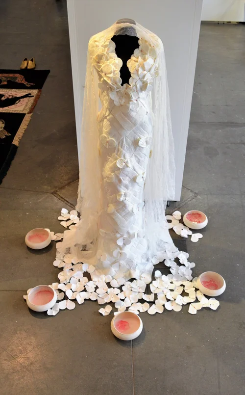 Dress is made of menstrual pads. Some are printed with conflicting words : challenging the trap of Dualism