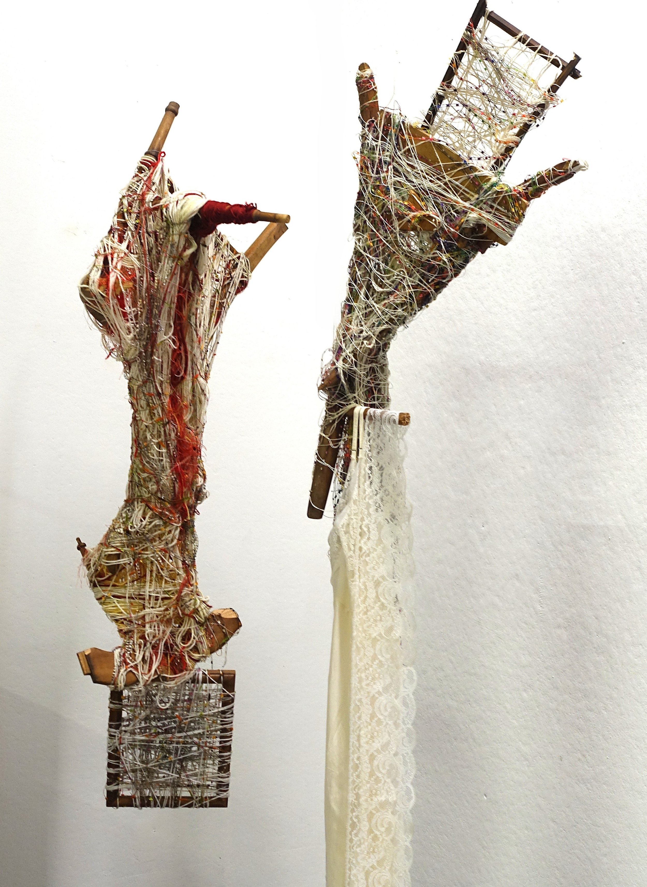 In this installation, which is constructed from found/made objects, sculptural lines and forms, I touch on existential questions regarding the past and the present, identity and experience. I inquire into the uncertainty of being. I am exploring what is left and absent, moving from the ground to the open space, and experiencing transformation. I am trying to capture the line or vein to explore the signs, marks, codes and symbols that may still be recognized for what they were before. Fragmentation and existential anxiety can be felt in the pieces that are tied and connected by string and metal. The minimal emptiness and presence express feelings that cannot be articulated.